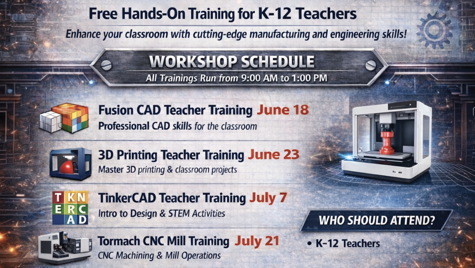 Our immersive workshops equip educators to confidently teach advanced manufacturing concepts—like robotics, 3D printing, CNC, welding, and blueprint reading—using real industry-grade equipment and best practices.